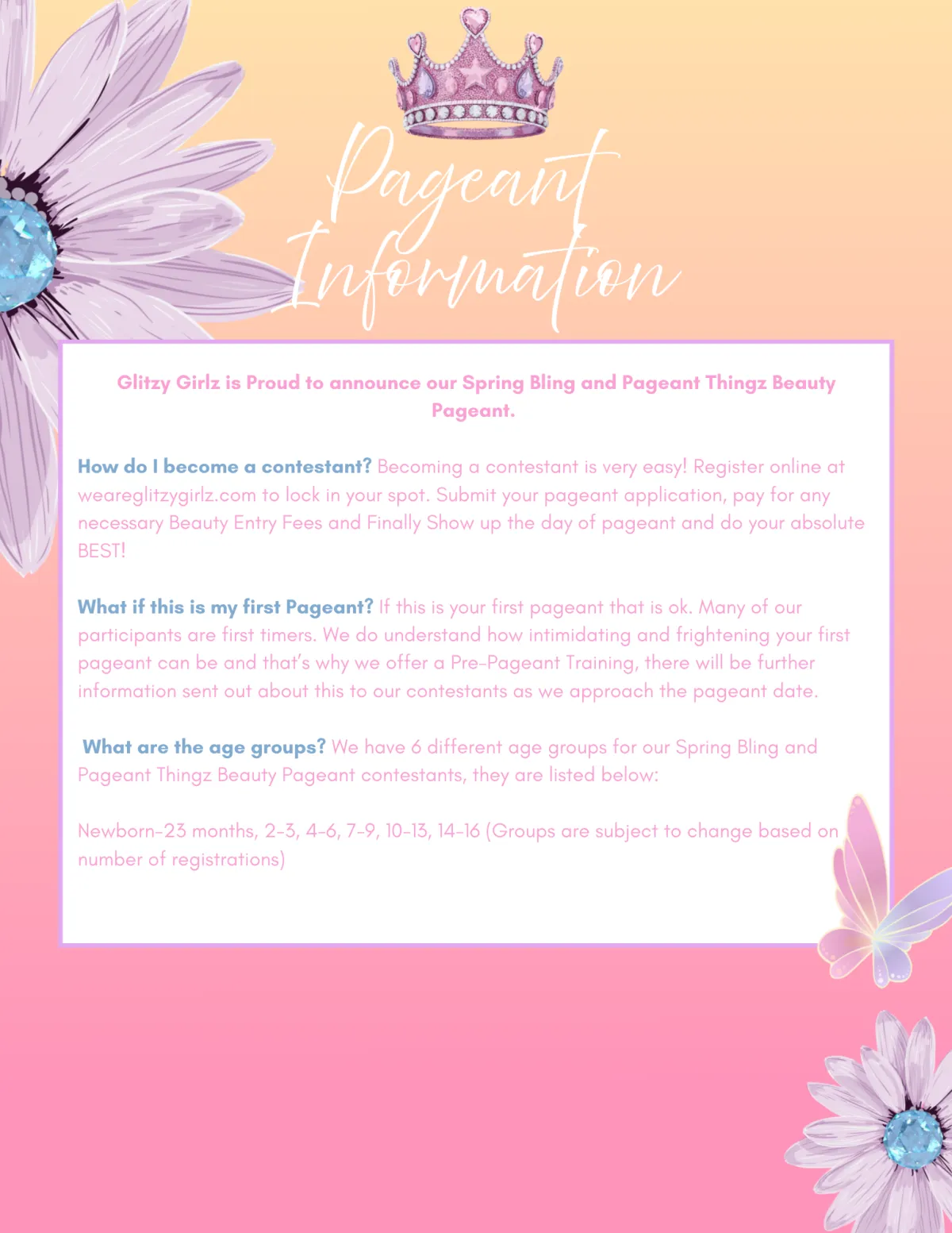 Glitzy Girlz holds beauty pageants for entertainment purposes of our girls. Every girl loves to dress up and feel pretty on the outside. We believe that offering this type of outlet is a way to build one’s confidence. It takes courage to walk across a stage in front of a large mass of people, and it takes confidence to know you are beautiful and proudly go through the process of the pageant. The pageants serve a purpose of letting girls show their confidence OUT LOUD!